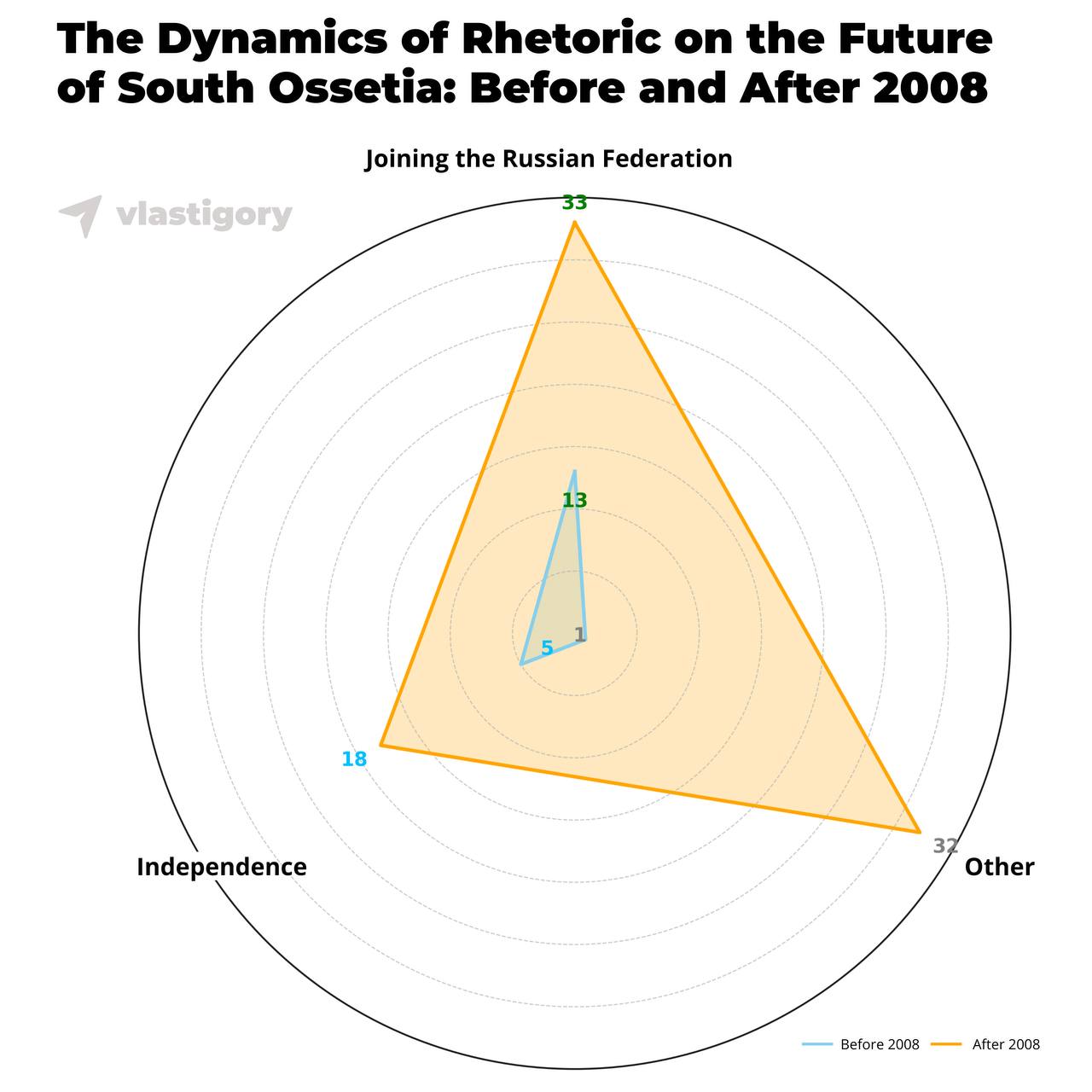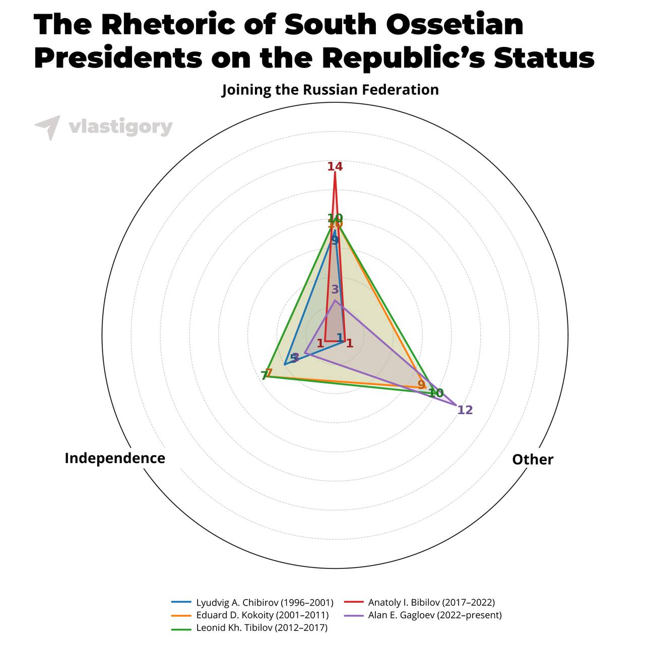 Not: Rakamlar, Güney Osetya devlet başkanlarının “Rusya Federasyonu’na Katılma”, “Bağımsızlık” ve “Diğer” kategorilerine göre yaptıkları açıklamaların sayısını göstermektedir. Rakam ne kadar yüksekse, konu o kadar sık ​​dile getirilmiştir.